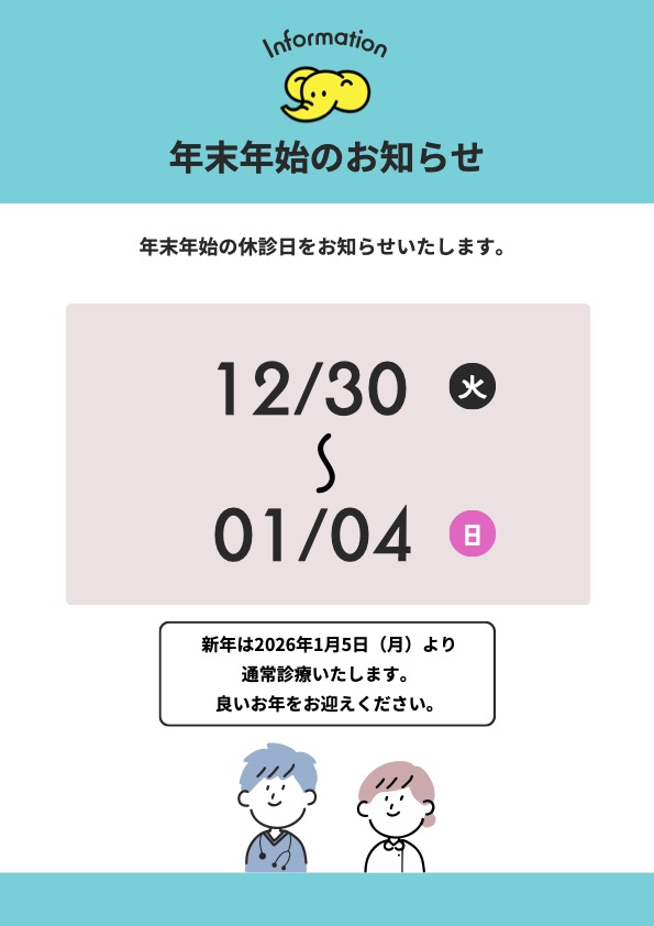 年末年始に伴い 12月30日(火)から1月4日(日)まで休診 とさせていただきます。期間中はお電話・窓口対応も休止いたします。ご不便をおかけしますが、何卒ご理解のほどよろしくお願い申し上げます。1月5日(月)より通常通り診療を再開いたします。良いお年をお迎えください☺️